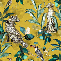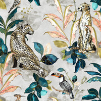 Wild yet refined, Cheetah by Laura Hyden captures the spirit of the savannah in a striking wallcovering. A poised cheetah and leopard lounge amid painterly foliage, set against an atmospheric, inky ground that suggests a hazy, sun-warmed landscape. A sophisticated palette enriched with jewel tones adds drama and polish—perfect for introducing glamorous flair to a tropical interior.