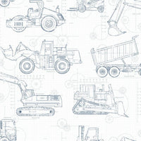 Inspire creativity and adventure with the Construction Blueprint Wallpaper by York Wallcoverings. Featuring detailed illustrations of excavators, backhoes, and dump trucks sketched over graph paper, this playful design is perfect for creating an imaginative play zone or themed bedroom.