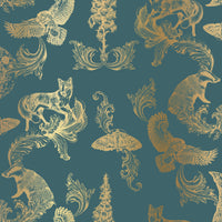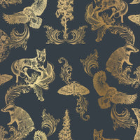 Discover a charming woodland tale by Laura Garner. Hand-drawn badgers, foxes, and birds nestle among forest foliage beneath a softly shimmering golden moon, all set against a deep charcoal ground. Sophisticated yet playful, this design offers a contemporary twist on classic damask—equally striking in a cosy country retreat or a chic city home.