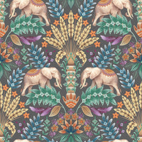 Immerse your walls in tropical splendour with this vivid Richard Hayley design. Hand-illustrated in a decorative, exotic-inspired style, a pair of majestic elephants stand amid abundant, lush palms. A rich charcoal ground sets off the colourful palette, lending an air of luxury and opulence. Dramatic and transportive, it brings the allure of faraway lands to any interior.