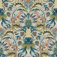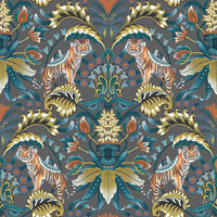 A striking design from Richard Hayley with hand drawn majestic tigers prowling through a stylised jungle of traditional exotic floral motifs and ornament. A rich palette of golden mustard and burnt orange pop against a deep charcoal background and add a warmth evocative of tropical climes. This bold wallpaper is sure to make a statement in any interior.