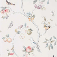 Originally crafted with watercolour pencils and paints, Fruit Aviary depicts vibrant Blue Jays and Wood Warblers amidst branches laden with peaches, cherries, pears, and plums. This charming botanical design brings a warm, inviting touch to country-inspired interiors.