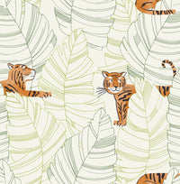 The Hiding Tigers Wallpaper by Seabrook Designs, from the Day Dreamers collection, features playful tigers peeking through lush tropical foliage, making it perfect for nurseries, kids’ rooms, or whimsical accent walls. Available in colorways such as Sky Blue & Orange, Green & Orange, and Black & Orange, it adds a fun and vibrant touch to any space.