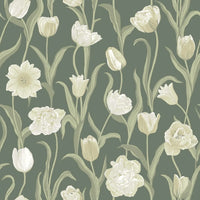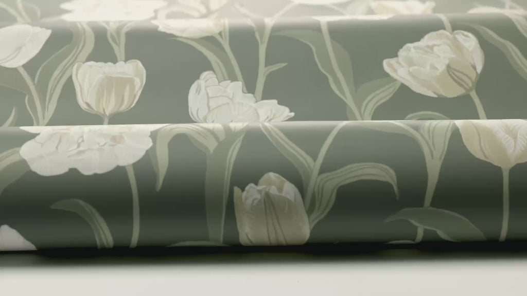 La Belle Epoque features cream-white tulips beautifully set against a deep jade-green background. The hand-painted, surface-printed design creates a lush and enchanting effect, surrounding your space with the elegance of a blooming tulip meadow.
