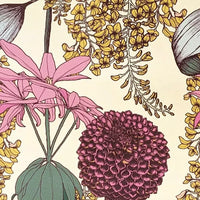 Laburnum by Abigail Borg—cascades of finely drawn laburnum spill around lush rhododendrons and pom-pom dahlias, all set against a sumptuous teal ground. A rich, layered botanical with graceful movement and timeless allure.