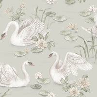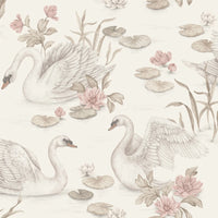 Coloured in soft shades of light pink, fresh white, and gentle brown, our Lily Swan wallpaper is both charming and chic. Dreamy illustrations depict graceful swans gliding across a still lake, surrounded by water lilies and blossoming flowers, creating a whimsical and heartwarming atmosphere.