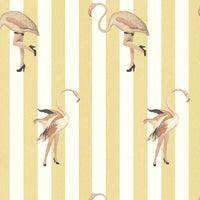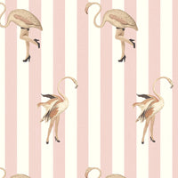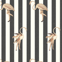 Marilyn Jet Stripe Wallpaper reimagines timeless stripes with a daring, surrealist twist. Bold black and cream verticals set a dramatic backdrop, brought to life by our signature Legs Eleven flamingos – part bird, part human – strutting across the design in blush pink and muted orange. The unexpected pairing of refined lines with whimsical hybrids captures the spirit of 1940s glamour while adding intrigue and fun to any space.