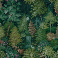 Midnight Woods Green unveils a lush, moonlit forest where layered foliage, delicate blooms and serene greenery are softly illuminated beneath a starlit sky. A gentle waterfall cascades into a still pool, creating a sense of quiet magic and depth within the dense, painterly landscape. A beautifully immersive design perfect for adding mood, mystery, and natural charm to any space.