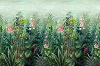 The Primavera Green Mural creates a visually stunning atmosphere with its painterly depiction of a lush, green landscape. It features a dense canopy of foliage and soft pink florals, designed to bring a refreshing, nature-inspired vibe to interior spaces like bedrooms or living areas.