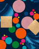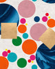 Multicolour / White (WP20330): The same vibrant geometric forms in gold, blue, pink, and orange set against a crisp white background.