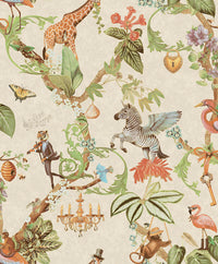 Safari Symphony transports you to a dreamlike jungle canopy where a violin-playing tiger, mythical zebra, and other whimsical animals gather among twisting vines, golden chandeliers, and vibrant blossoms. This enchanting design is alive with pink flamingos, monkeys riding exotic birds, and curious treasures like vintage keys and heart-shaped lockets, creating a fantastical tapestry full of surreal charm. Perfect for adding imagination and wonder to any room, this Holden Décor wallpaper captivates both children and adults alike.