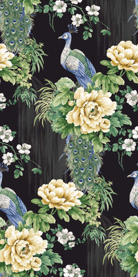 Sandy is a stunning Chinoiserie-style design that features a striking peacock perched amidst flower-covered branches. Printed on a luxury natural grasscloth substrate, the textured background adds significant depth and an organic feel to the intricate botanical artwork.
