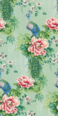 Duck Egg / Turquoise (CL31304): A soft, pearly light green or aqua base with rich pink and blue motifs.