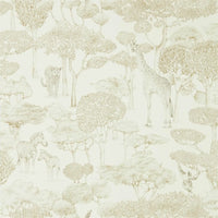 Shamwari Wallpaper by Harlequin is a striking modern toile, hand-drawn in the Harlequin studio using a fine ink pen. Intricate detailing reveals a rich menagerie of wildlife—including zebras, leopards, giraffes, monkeys, and a tiny parrot—nestled among beautifully shaped trees for a captivating, storybook effect.