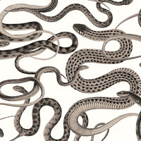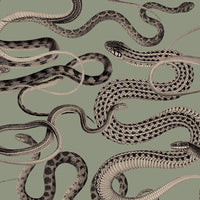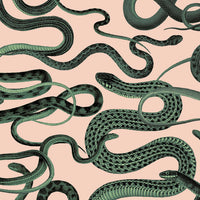 You’ve seen snakes on a plane—now you can have them on your walls. Bold and captivating, Snakes On A Plane Sherbet features lifelike, twisting serpents weaving across a smooth blush-pink backdrop, their dark green scales creating striking contrast and dramatic flair. Inspired by natural history illustration, this designer wallpaper blends classic artistry with an unconventional, statement-making edge, perfect for adventurous interiors.