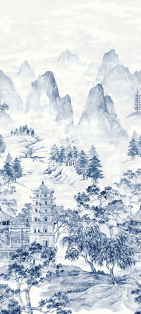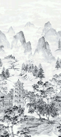 Stoney Lane is a beautiful ink-wash style mural depicting a tranquil Asian landscape. It features majestic mountains, delicate pagodas, and lush trees, rendered in a painterly aesthetic that brings a culturally rich and calming atmosphere to any room.