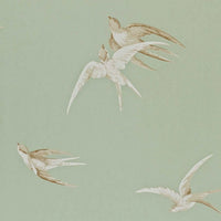 Swallows a serene design dating from the 1930s exemplifies the stylised elegance associated with this era. Originally a chintzed cotton fabric it shows a flock of slender swallows soaring through the open sky. Available once more as a fabric it is now also available as a wallpaper.