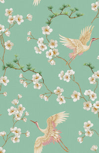 Swithins Walk is a luxury Chinoiserie wallcovering that depicts a serene scene of white cranes in flight set against delicate cherry blossom trees and green pine needles. This specific version is a 100% linen textile wallcovering, which offers a soft, fabric texture and a sophisticated hand-crafted appearance. Because it is a genuine linen product, the visible seams and natural variations in the textile are intentional design elements that add to its high-end character.