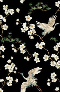 Swithins Walk is a luxury Chinoiserie wallcovering that depicts a serene scene of white cranes in flight set against delicate cherry blossom trees and green pine needles. This specific version is a 100% linen textile wallcovering, which offers a soft, fabric texture and a sophisticated hand-crafted appearance. Because it is a genuine linen product, the visible seams and natural variations in the textile are intentional design elements that add to its high-end character.