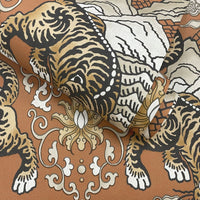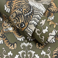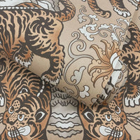 Inspired by Chinese culture, the Tora Wallpaper embodies bravery and strength, with a detailed tiger motif at its heart. Set against an earthy background, ornate scroll patterns weave across a central mountain range, creating a dramatic ombré focal point framed by the majestic tiger. A subtle canvas texture throughout gives the design a delicate, fabric-like appearance.